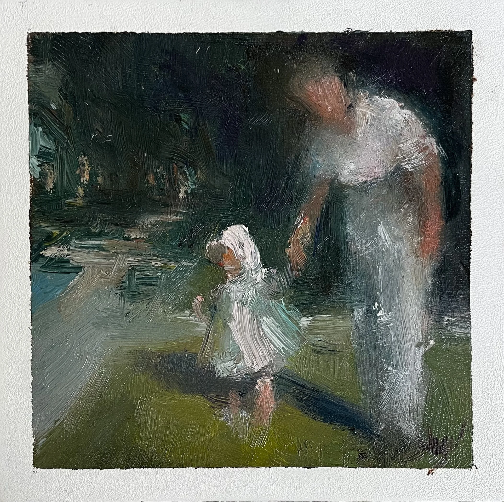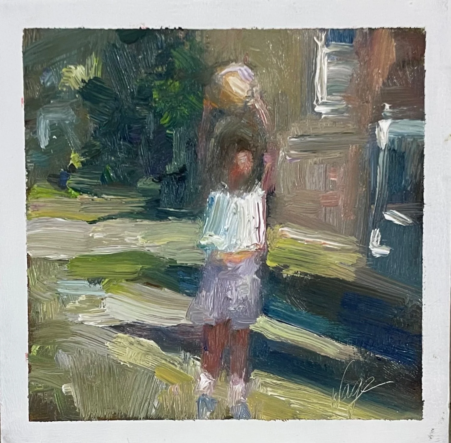 In the photograph that inspired this painting, I’m about six or seven, holding a ball over my head like I’m about to shout “Catch!” I was looking at the person who took the photo, expecting them to be on the other end, ready. But they were taking the photo so how could they catch that ball? But now, in the painting, the person I’m looking at is you. The photographer has disappeared, and now you, the viewer, are the one I’m throwing it to. Maybe the ball is just a ball—or maybe it’s a stand-in for all the things we send out into the world with hope: a gesture, a story, a need, a truth. As a child, I believed someone would be there to catch it. I’m not sure they were.